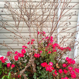 Harry, I would love for the New Dawn to grow over the stoop roofs, but so far any canes that have gotten above the galvanized aluminum roof has fried, so I'm not sure that's going to work. The rose is going in to it's fourth year and so far I have not had much issue with it getting good bloom down low, but this is the first year I've ended spring pruning with canes above the trellis so we shall see--this is very much a learning experience for me.