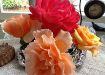 Here's a picture of a large rose of mine called Valencia. It's a fantastic rose. So far it has no scent - but it's supposed to. Sometimes my roses don't get scent until year four and then wow!! This is a rose I think would be great for your mom. There are lots of gorgeous roses on this plant. And the flowers last for weeks on the bush.