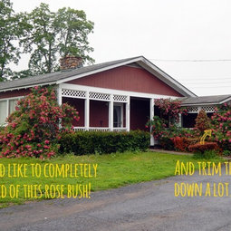 michael is right. Get a pair of long handled loppers and start chopping. It's the fastest way. You may even find that after you lop off a lot of top growth, you want to keep both rose bushes. They look very healthy, but are a bit overgrown.