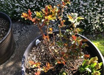 As seil said, it can be hard to tell whether a plant is suffering from too much or too little water. Water larger pots 2 gallons at a time and let the surface dry slightly before watering again, maybe every two days. They might want as much as 8 gallons a week in very hot weather.