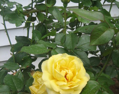 About Peter Mayle: Maryl, in my garden, Peter Mayle is not a "space-eater." In fact, it has been a rather narrow, vertical/upright bush and I've wished it would be a bit fuller on the sides. Maybe its narrowness is due to where I planted it--on the west side of my neighbor's garage (along the property line) stuffed between two bigger and more aggressive roses that maybe force Peter to grow vertically in order to get high enough to get his share of sunshine? Don't know.
