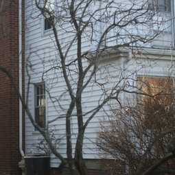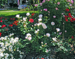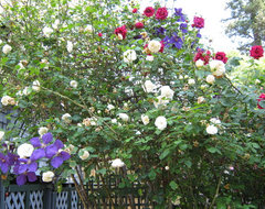 Another rose which is trying to swallow my house is Sombreuil (the mystery large flowered climber). It is reputed to be a wichurana hybrid. If that is the case, it seems as if it should be more cold hardy than the zone 6 assigned to it by HMF. It is on a similar arch to Cl Iceberg, and it has made more progress up the house when it finally got there than Iceberg has. I don't have a picture of it doing that, but here is a cool picture of part of the same bush on its arch with Cl Crimson Glory and the clematis Jackmanii.