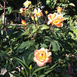 You won't believe this (or you may) but the rose I love most and just bragged about being high heat and potent sunshine tolerant is Brandy, the grandparent of your Strike it Rich. The reason I looked is that your baby looks a lot like Brandy. (at least from a distance) Brandy is a solid color but definitely similar.