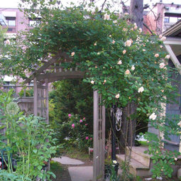 Any chance you could continue the trellising around the back of the steps, or around & onto the back wall, so the rose might have more room to stretch? If you could wrap the trellising past the steps onto the back wall, you might plant the climber on the corner. Nice trellis job!