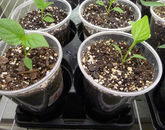 Here is a picture of pepper seedlings recently transplanted into their own containers (the clear cups work indoors only, I tried experimenting with them one spring. I prefer transplanting into 9 or 18 oz. SOLO cups, I just didn't have a good picture to show). Notice how high the soil line is in the cup? That is what you should be shooting for.